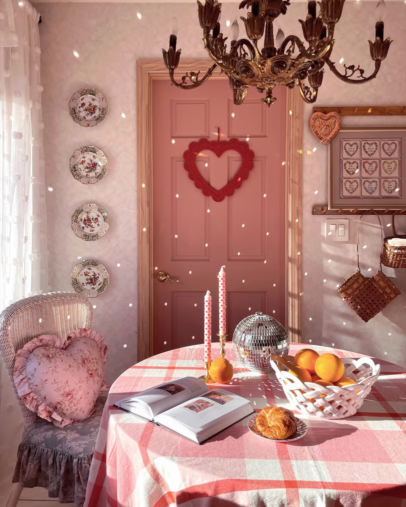 Add heart-themed decor throughout your home for a cohesive Valentine’s Day vibe. Consider throw pillows with heart patterns, a tablecloth adorned with hearts, or a decorative heart wreath for your front door. Pair these with subtle accents like heart-shaped trinkets on shelves or small framed artwork to create a space that’s warm and inviting without feeling overdone.