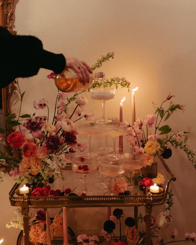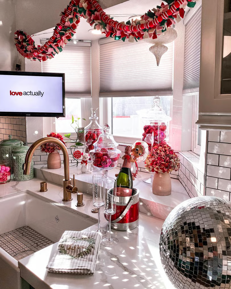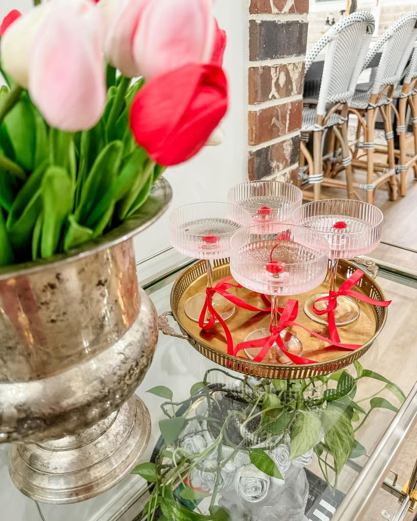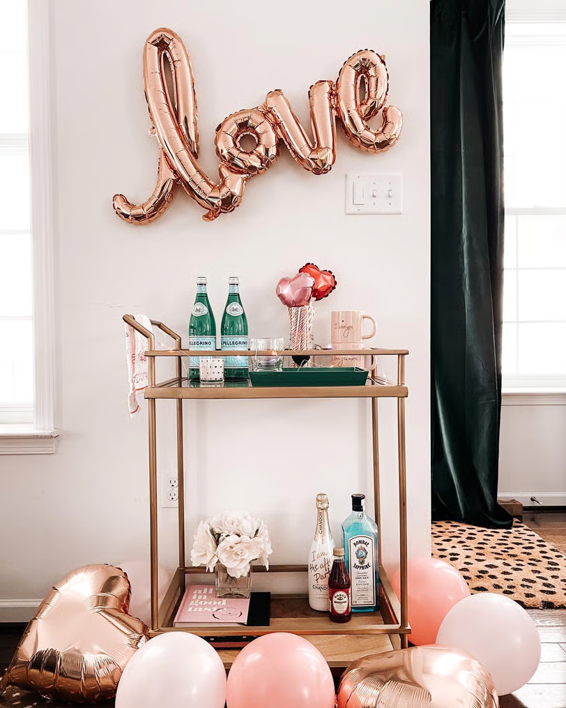 If you have a bar cart, embellish it with Valentine’s-themed decor. Add balloons, flowers, or even a bottle of pink champagne to set the tone. Include festive glassware and colorful cocktail napkins to make it a standout feature during your celebration.