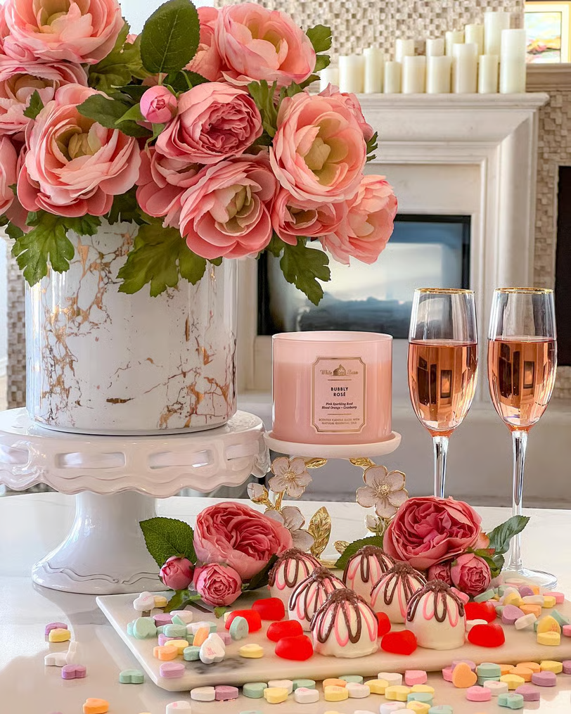 Flowers are a timeless Valentine’s Day staple. Arrange bouquets of roses, tulips, or peonies in vases around your home to bring life and fragrance to every corner. Consider mixing colors like red, pink, and white for a balanced look, and don’t forget smaller arrangements for side tables and bathrooms to spread the festive spirit.