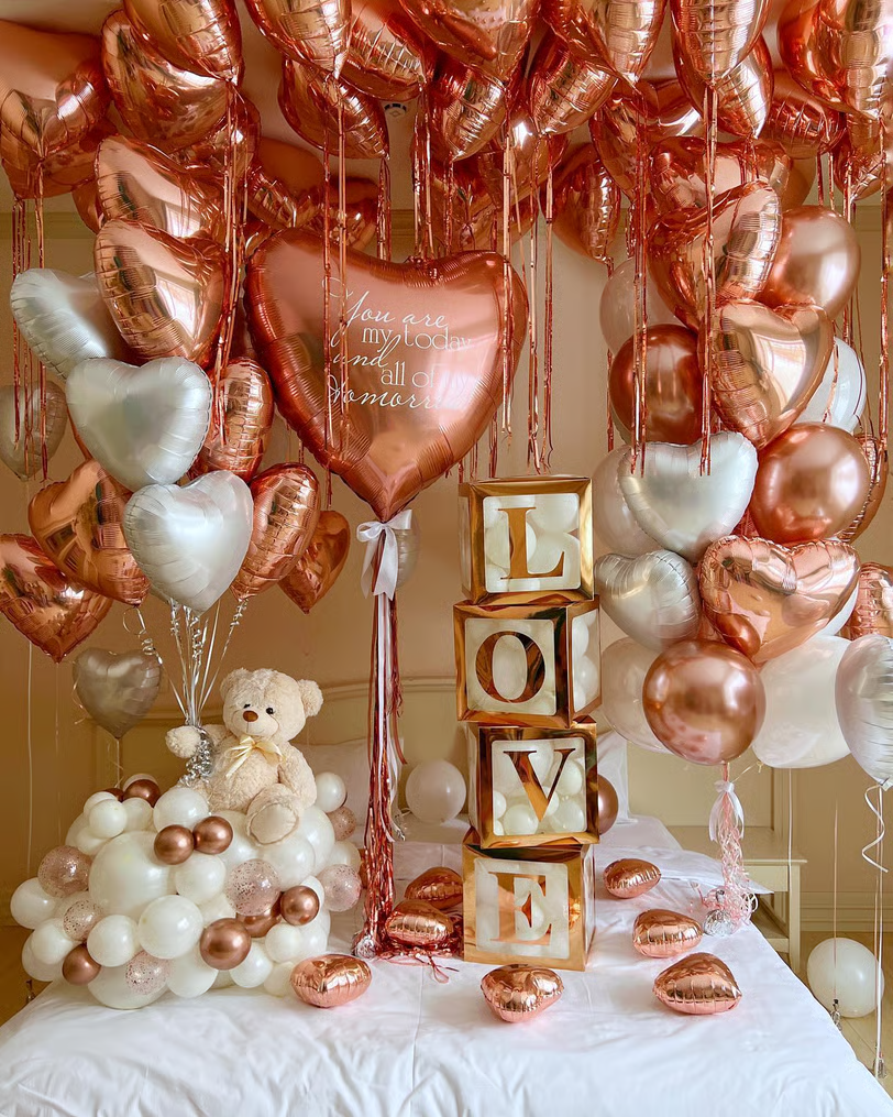 Helium balloons in heart shapes are festive and fun. Scatter them around the room or create a romantic arch as a focal point for your celebration. To elevate the look, choose metallic or matte finishes and combine them with ribbons or tassels in complementary colors.