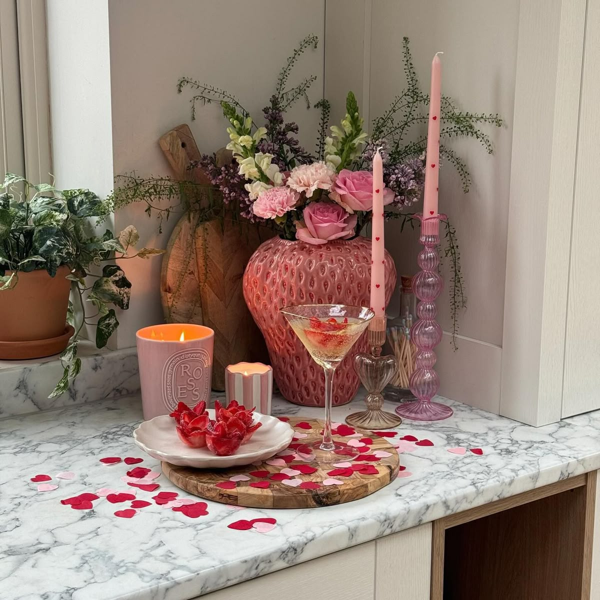 Don’t forget kitchen textiles. Swapping regular dish towels for those in Valentine’s tones or hanging a festive apron adds small joyful touches throughout the space. If you have open shelving, consider adding a few items in coordinating shades — perhaps a ceramic bowl or colored pieces that already fit your aesthetic.