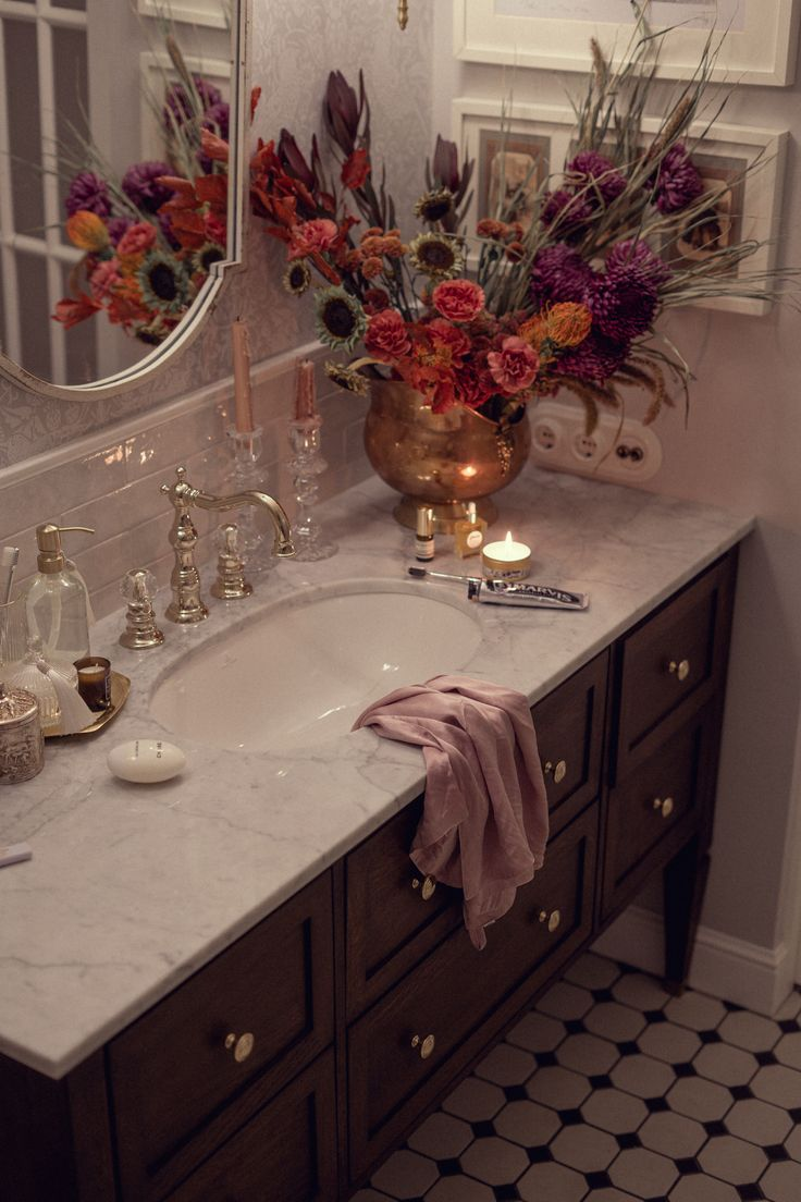 If you’re planning a Valentine’s bath, consider floating flower petals in the water alongside your candles for an indulgent touch. Practical decorating can also be beautiful: replace everyday hand soap with something in an elegant bottle, add a small vase with a single stem beside the sink, or feature your favorite soaps and salts in glass containers. The bathroom should feel intentional, not like an afterthought.